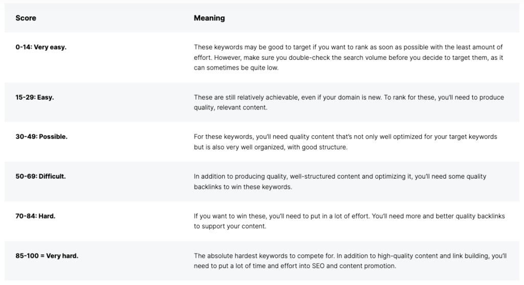 Once you’ve gathered data about your keywords you can start choosing keywords to focus on. If your goal is to rank in searches as quickly as possible, go for the low hanging fruit: keywords with a reasonable MSV and a relatively low difficulty score (think 30 or below).