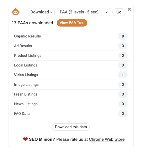 SEO Minion has become one of my new favorite SEO tools. Specifically, I like that it provides an easy way to download search engine result page (SERP) data. For instance, if I want a copy of the People Also Ask (PAA) data, I can download it quickly to a CSV, even without clicking into the results to see more.