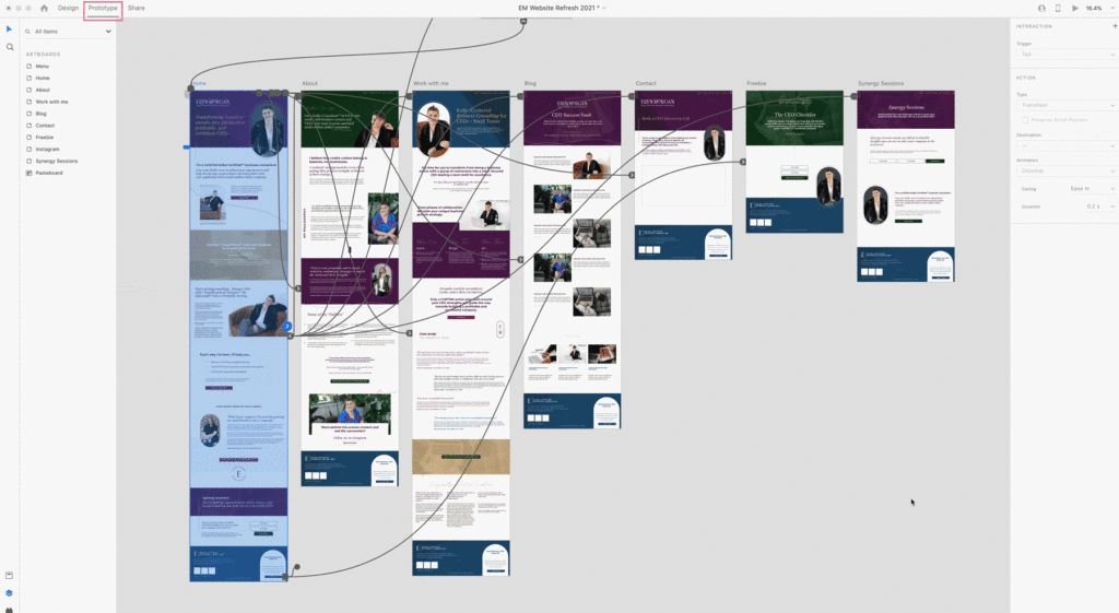 She proceeds to design the rest of the website, including options for special effects and graphics that she’s able to import to Showit later. Then, Ingrid prototypes the site inside Adobe XD to get a feel for the natural flow of the site before easily exporting her assets and recreating the experience inside Showit.