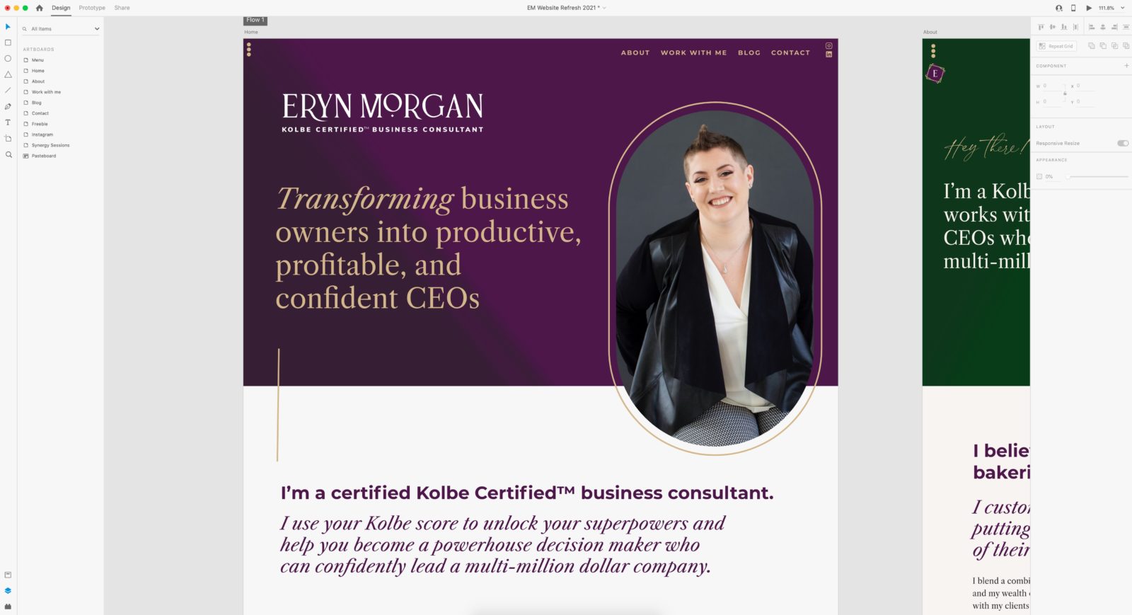 Ingrid first designs her websites in Adobe XD. She starts with her homepage artboard, for which she has created a preset: “I like to do 1200 pixels wide [artboard] to match the Showit builder and also to know how things will look on a tablet (no running off the edges) because that is the maximum space that we will have on the actual website.”