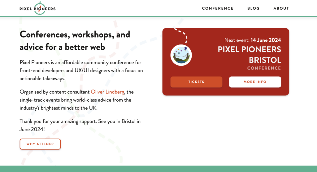 Pixel Pioneers is the conference for web designers, developers, and digital creatives in a forum dedicated to advancing digital design and front-end development. This event hosts industry leaders and practitioners; sharing insights into the latest trends, tools, and strategies vital for elevating your skills. One special aspect of this conference is its diverse sessions covering topics from responsive design to emerging technologies. The goal for this conference is to foster a community committed to innovation and excellence in digital creation. Attendees benefit from actionable knowledge, networking, and a platform for career advancement. If you are intrigued, click here to learn more.