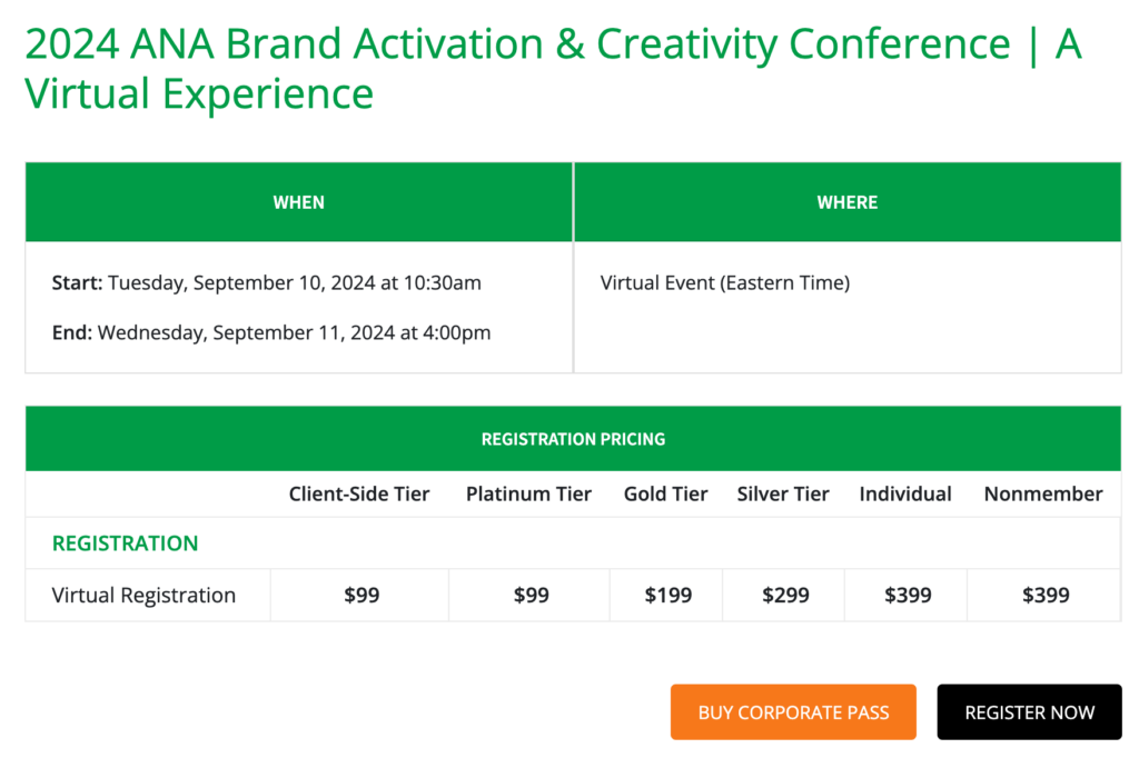 The ANA Brand Activation and Creativity Conference annually brings together marketing professionals, advertisers, and industry leaders to explore the latest trends and innovations in brand development. This virtual conference serves as a hub for insights, workshops, and discussions led by prominent figures in the industry. The main goal is to inspire creativity and innovation within brand activation strategies. Notably, the conference stands out for its emphasis on showcasing real-world case studies. It offers practical lessons and strategies from successful marketing campaigns, providing attendees with actionable insights for their own brand initiatives. If you are on your way to mastering branding, this is that conference for you. Learn more about this virtual event here.