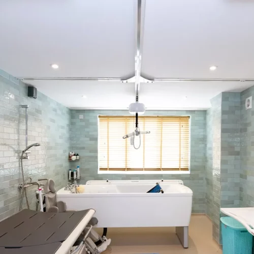 If accessing the ceiling is not possible or your ceiling joists cannot support a hoist system’s weight, our wall-mounted solution may be the best alternative! This system attaches to the wall with sturdy brackets, featuring flat metal plates with sections to securely attach the rails. One of the main advantages of wall-mounted systems is their quick installation process. Unlike ceiling-mounted tracks that require cutting or drilling through the ceiling, wall-mounted systems involve attaching brackets to the wall, onto which the rails are easily slotted. This streamlined installation typically takes only half the time required for a ceiling-mounted system. Furthermore, wall-mounted systems excel in rooms with high ceilings or limited floor space, making them a versatile choice for various environments.