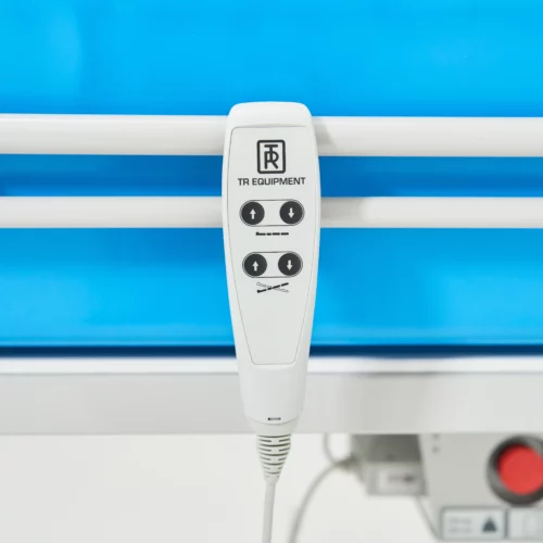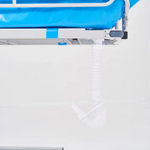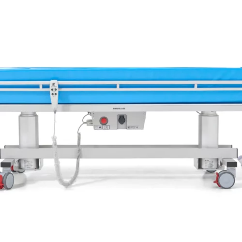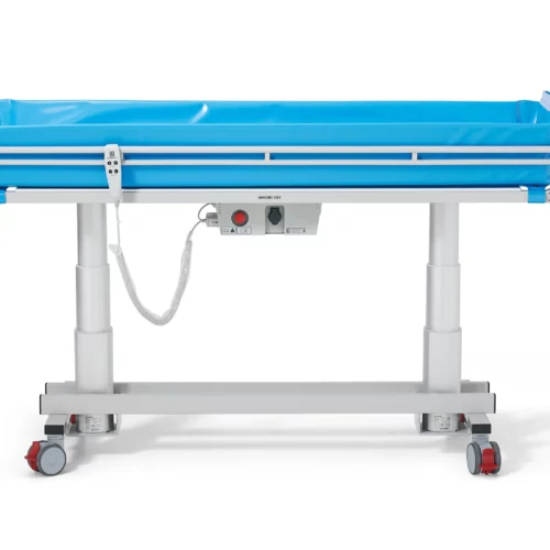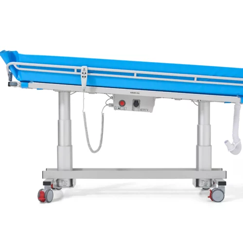 The TR 3200 Battery-Operated Shower Trolley is a versatile and ergonomic solution for safe patient transfers and comfortable care. With a 230 kg (500 lbs) capacity, it features dual side-mounted columns for enhanced bed overlap, ensuring smooth and secure transfers. Its dual drainage system allows flexible patient positioning in either direction, providing added convenience for caregivers. Available in two sizes, the TR 3200 offers a choice between onboard or removable rechargeable batteries and is IPX5-rated for water resistance. Delivered ready to use, it includes a MagCode charger, mattress, head pillow, four braked castors, and a 1-meter drainage hose.